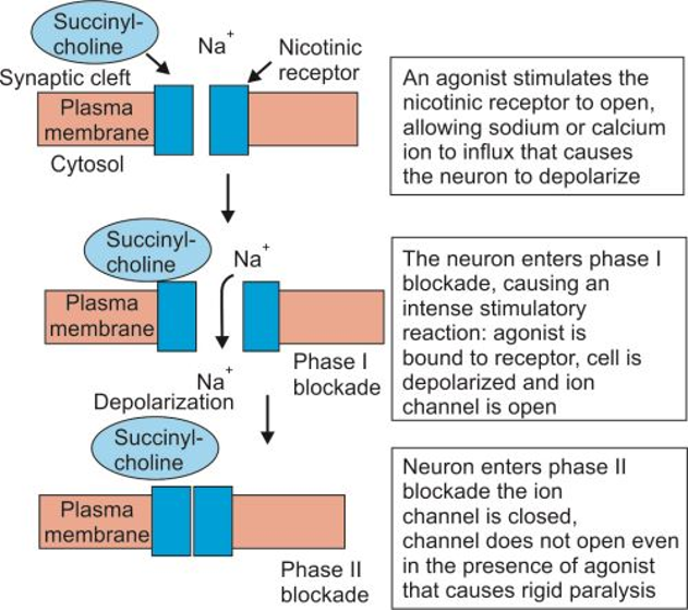 ● 受体不能传递更多的神经冲动,表现骨骼肌松弛。